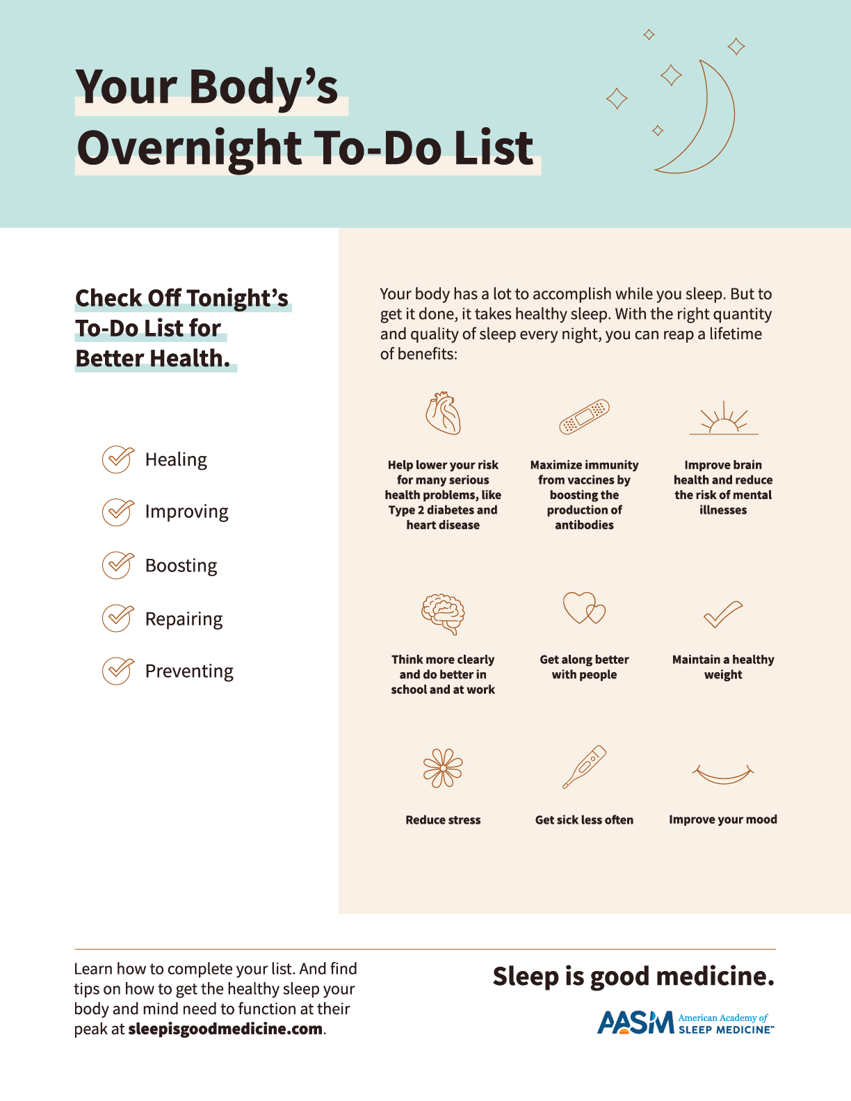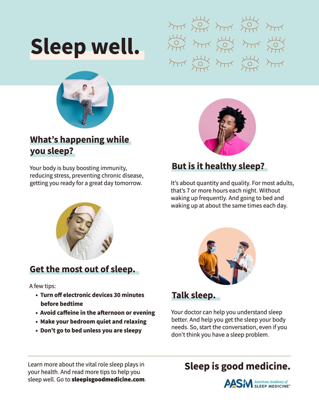 Sleep is a biological necessity for health and well-being. Getting healthy sleep can help your patients actively fight, manage, and prevent chronic conditions, like Type 2 diabetes, Alzheimer’s, and heart disease. It may also help them improve their mood, maintain a healthy weight, and make better decisions. And when you help your patients sleep better, it can improve your care and patient outcomes.