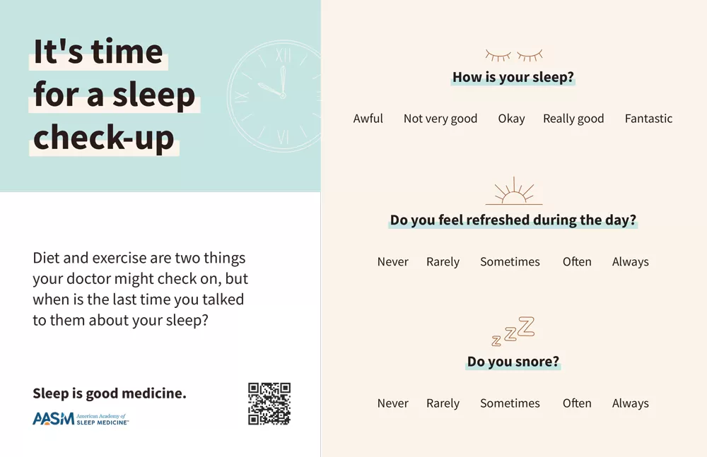 Expand your intake questions to screen for poor sleep. Ask one simple question, “How is your sleep?” or use AASM’s sleep questionnaire, which is available in English and Spanish.